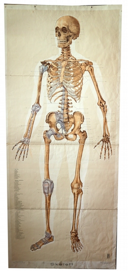 Skelett. Köln, Deutsches Gesundheitsmuseum u.a. ca. 191 x 83 cm. Farbige Illustration. Aus der Reihe: Biologisch-hygienisches Unterrichtswerk des Deutschen Gesundheits-Museums Köln, I., der menschliche Körpe Schulwandbild mit anatomischer Darstellung in Lebensgröße, auf kräftigem Papier, rückseits mit Leinenstreifen umrandet, in vier Teilen aufmontiert. Am oberen Rand mit zwei Ösen sowie rückseits mit Teilen einer kleinen Holzleiste. Etwas knitterfaltig, an den Falzstellen mit kleinen Abreibungen bzw. kleinen Einrissen. Legende mit 82 Bezeichnungen, die linke Körperhälfte mit Bändern und Sehnen. Beeindruckende, lebensgroße Darstellung des menschlichen Skeletts. Wird als Sperrgut versandt, daher die erhöhten Portokosten. Versand nur innerhalb Deutschlands und der EU möglich.