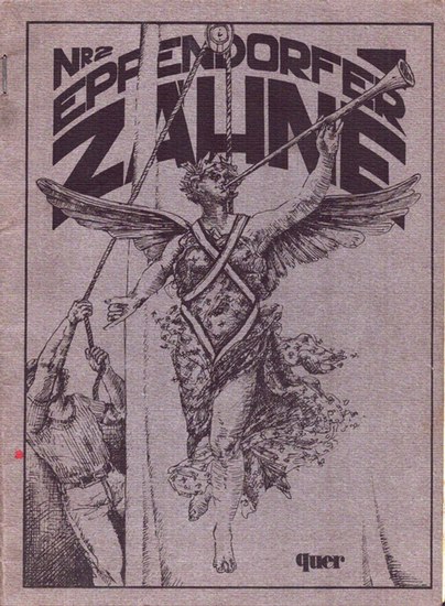 Eppendorfer Zähne. Nr. 2 (von 2 = wohl alles Erschienene). (Hamburg), Quer-Verlag, [o. J.]. 16 S. 20 x 15 cm. Illustr. OU. Geheftet. Anthologie mit Gedichten und Prosatexten der Hamburg-Eppendorfer linksliterarischen Szene ("Zähne" = ndt. Zeehne) in Schreibmaschinentypographie von: Christoph Derschau (2), Ralf Thenior (3), Uwe Wandrey (1), Joachim Fuhrmann (2), Gerd Fuchs und Katrine von Hutten (je 1). Beitrag von G. Fuchs durch Montagefehler rückläufig zu lesen. - Der erste Band dieser "Fanzine" (für Freunde, Fans u. Gäste der berühmten Kneipe "Borchers' Café & Destillation" in Hamburg) erschien 1975. - Leicht gebräunt, letztes Bl. zwei Fleckchen. - Selten!.