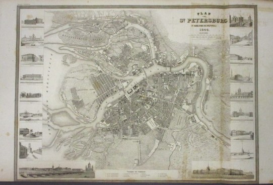"Stadtplan von St. Petersburg 1844". Stadtplan in Stahlstich. Aus: Meyer's Handatlas. Hildburghausen, Bibliogr. Institut, 1844. Ca. 35,5 cm x 48,5 cm. Schöner Stadtplan von Sankt Petersburg von 1844 mit 18 dekorativen Ansichten der wichtigsten Gebäude der Stadt am linken und rechten Blattrand. - Leicht gebräunt, etw. braunfleckig, einmal gefaltet.