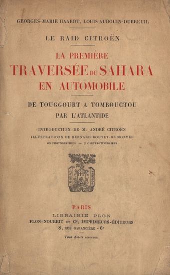 La première traversée du Sahara en automobile de Touggourt à Tombouctou par l'Atlantide. Introduction de André Citroën. Illustrations de Bernard Boutet de Monvel. Paris, Plon-Nourrit, (1923). 8°. 307 S. mit 60 Photographien, 1 gefaltete Karte. OKt., 1. (= Le raid Citroën). 1. Ausgabe. Der Generaldirektor von Citroën, Georges-Marie Haardt (1884-1932), leitete die mit Kettenfahrzeugen der Firma 1922 gemeisterte Durchquerung der Sahara. - Gebrauchsspuren, in dieser Originalgestalt selten.