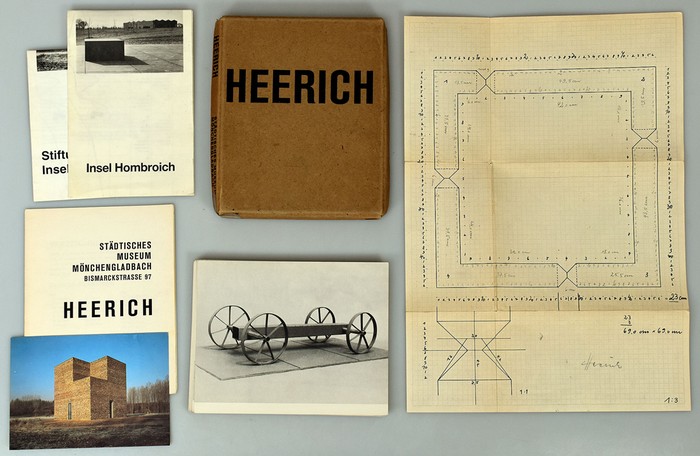 Kassettenkatalog zur Ausstellung HEERICH, 18.11.-31.12.1967. [Signiert.] Mönchengladbach, Museum Mönchengladbach, 1967. Braune Original-Kartonschachtel mit schwarzem Aufdruck auf Deckel und Seite, geklammert, 21 × 17 × 2 cm. Nummer 177 von 330 nummerierten Exemplaren mit dem beiliegenden, gefalteten Konstruktionsplan, dieser von Erwin Heerich im unteren rechten Bereich mit Bleistift signiert. Maße Konstruktionsplan: 41,0 × 28,8 cm. Ein Ausstellungsheft mit Titelblatt, Verzeichnis der Werke (161 Nummern), Liste der Leihgeber, Dank und Kolophon, auf 2 losen gefalzten Bögen, Maße: 19,5 × 15,5 cm. 19 Bildtafeln auf Karton verso nummeriert I - IXX; Tafel I - IX: recto jeweils eine Schwarz-Weiß-Abbildung von Kartonplastiken, verso fortlaufender Text von J. Cladders und Bildangaben, Tafel X - IXX: recto jeweils eine Schwarz-Weiß-Abbildung von Zeichnungen, verso Bildangaben, Tafel IXX verso mit Biografie des Künstlers, Maße: jeweils 19,5 × 15,5 cm. Druck und Klischees: Graphische Kunstanstalt Schagen & Eschen, Mönchengladbach. Hier zusätzlich beiliegend: 2 gefaltete Broschüren mit dem Übersichtsplan der Museumsinsel Hombroich aus verschiedenen Jahren, der ältere mit 14, der jüngere mit 16 ausgewiesenen Gebäuden/Stationen, diese jeweils einmal horizontal gefaltet, sowie eine farbige Postkarte mit einem Gebäude von Erwin Heerich. Kassette wenig fleckig, an einer Ecke mit Gewebeband verstärkt, eine andere Ecke im Falz mit Einriss. Eine Tafel rückseitig leicht fleckig, eine vorderseitig mit kleinem Fleck im Motiv (ca. 0,3 x 0,3 cm). Ca. 3 Tafeln im Randbereich (außerhalb der Abbildung) mit winzigen blassen Fleckchen (kaum sichtbar), einige Ränder teils schwach fingerfleckig, wenige Kanten mit schwachen Stoßstellen. Allgemein sehr guter Zustand.