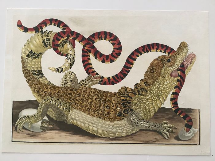 Caiman. Facsimile. Metamophosis insectorum Surinamensium. Netherland, Heritage Prints. 36 : 52 cm. Colopured facsimile-print on white etching paper. Quality facsimile print.