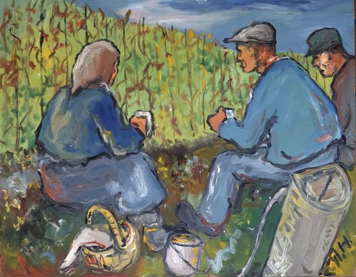 Weinbauern bei der Rast im Weinberg. um, Öl auf Hartfaserplatte, 1950. 51x64,5 cm *Rechts unten monogrammiert. *G. F. Hoppstädter (1906-1987, Saarbrücken), 1921/25 Lehre als technischer Zeichner, 1935/36 Studium der Malerei an der Kunsthochschule Saarbrücken u.a. bei Fritz Grewenig. Erste Einzelausstellung 1952, sein Werk wurde erst posthum umfangreich gewürdigt.