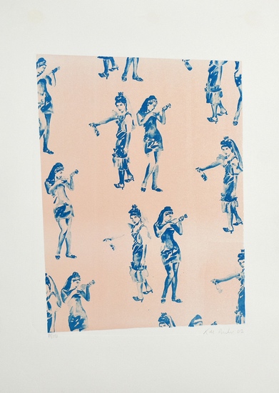 Frauen mit Sprühflaschen. 2002. [Signierte Original-Farblithografie.] _. (Fides Becker, geb. 08.03.1962 in Worms, deutsche Malerin und Grafikerin). Nummer 84 von 250 Original-Farblithografien von Fides Becker auf Büttenpapier, unterhalb der Abbildung mit Bleistift signiert, datiert ('02) und nummeriert. Blattgröße: 59,2 x 42,1 cm. Abbildungsgröße: 40,1 x 29,3 cm. Herausgegeben von der Tabor Presse Berlin 2003. Blatt rückseitig am oberen Rand mit oberflächlichen Reibespuren und blassen gelblichen Klebespuren, die schwach durchscheinen, ansonsten sehr guter Zustand.
