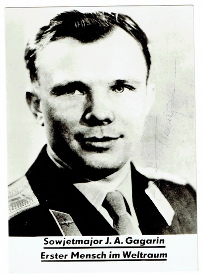 Portraitphotographie in Uniform mit eigenh. Unterschrift. ohne Ort und Datum. 100 : 150 mm. Brustbild in Uniform mit Aufdruck ?Erster Mensch im Weltall?.