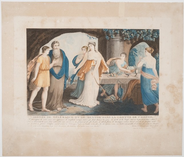 Arrivée de Télémaque et de Mentor dans la Grotte des Calypso. - Paris:, [um 1820]. Kupferstich 19 x 29,5 cm, Blattgröße 34 x 40,5 cm. Der Kupferstich in Punktiermanier von Legris nach Hubert, mit Farbplatten und altkoloriert, zeigt die Ankunft des jungen Telemach mit seinem Begleiter Mentor in der Grotte der Calypso. Sie ist umgeben von jungen Nymphen. Unter dem Bild der Titel, 4 Reihen Text in französischer Sprache, die Namen der beteiligten Künstler. - Illustration zu Fénélon, Histoire de Télémaque, erste Veröffentlichung 1699. - Telemach sucht seinen Vater Odysseus. Nach einem Schiffbruch landet er, begleitet von Mentor (d.i. die Göttin Athene, die sich verwandelt hat), auf der Insel Ogygia. - Das Papier im Rand deutlich gebräunt und fleckig, das Bild sauber und klar im Druck. Die Darstellung ausdrucksstark.