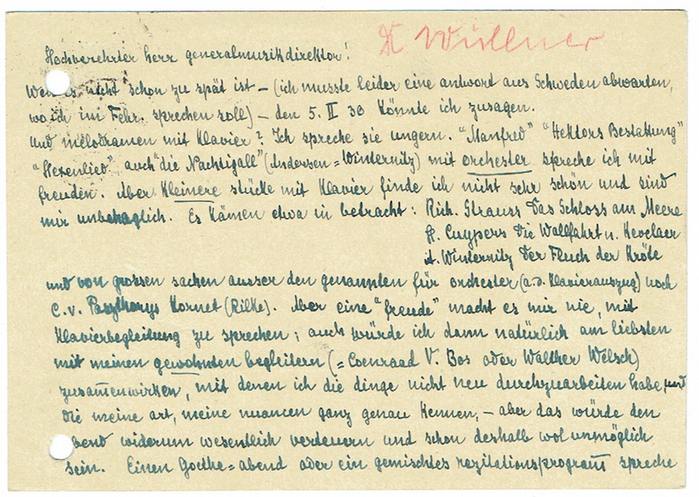 Eigenh. Postkarte mit Unterschrift. Jessen, 22. V. 1929. 8vo. 1 p. Gelocht. An den Generalmusikdirektor Raabe in Aachen. ?den 5.II.30 könnte ich zusagen. Und Melodramen mit Klavier? Ich spreche sie ungern. ,Manfred, ,Hektors Bestattung?, ,Hexenlied?, auch ,die Nachtigall? (Andersen-Winternitz) mit Orcehster spreche ich mit Freuden. Aber kleinere Stücke mit Klavier finde ich nicht sehr schön und sind mir unbehaglich. [?]? ? Nach erfolgreicher Karriere als Schauspieler gab der promovierte Philologe 1896 am Weimarer Hoftheater als erste Opernpartie den Tannhäuser, der zu seiner Glanzrolle werden sollte. Als Sänger wie als Rezitator erfolgreich, führten Konzerttourneen ihn u. a. nach Wien, London und New York, wo er 1910 in der amerikanischen Erstaufführung der ?Kindertotenlieder? unter der Leitung Gustav Mahlers mitwirkte.