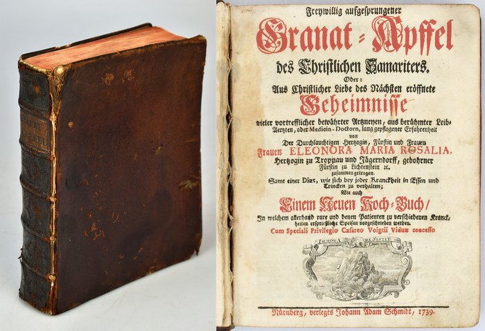 Freywillig aufgesprungener Granat-Apffel des Christlichen Samariters. Oder: Aus Christl. Liebe des Nächsten eröffnete Geheimnisse vieler vortrefflicher bewährter Artzneyen, aus berühmter Leib-Aertzten, oder Medicin-Doctorn, lang gepflogener Erfahrenheit von Der Durchlauchtigen Hertzogin zu Troppau und Jägerndorff, gebohrner Fürstin zu Lichtenstein etc. zusammengetragen. Samt einer Diaet, wie sich bey jeder Krankheit in Essen u. Trincken zu verhalten. Wie auch Einem Neuen Koch-Buch, In welchem allerhand rare und denen Patienten zu verschiedenen Kranckheiten ersprießliche Speisen vorgeschrieben werden. Band 1 (von 2). Nürnberg, verlegt durch Johann Adam Schmidt, 1739. 8°. 20,5 x 16,5 cm. [1] Blatt, 588 Seiten, [5] Blatt. Lederband der Zeit auf 5 Bünden mit Rücken mit reicher Blindprägung und rotem Sprengschnitt. Etwas spätere Ausgabe. vgl. Weiss 2300. Titelblatt in Rot und Schwarz mit gestochener Titelvignette, eine Kopfvignette in Holzschnitt im Text. Einband etwas bestoßen und mit Fehlstellen im Lederbezug. Vorderes fliegendes Blatt lose beiliegend, Gelenke angeplatzt. Seiten leicht gebräunt und etwas stockfleckig. Gutes Exemplar. Leather binding of the time with five raised bands, spine richly blind-tooled, red sprinkled edges. Slightly later edition. Cf. Weiss 2300. Title page printed in red and black with engraved title vignette, one woodcut headpiece in the text. Binding somewhat bumped with small losses to the leather, joints cracked. Front flyleaf loosely laid in. Pages lightly darkened and somewhat foxed. A good copy.
