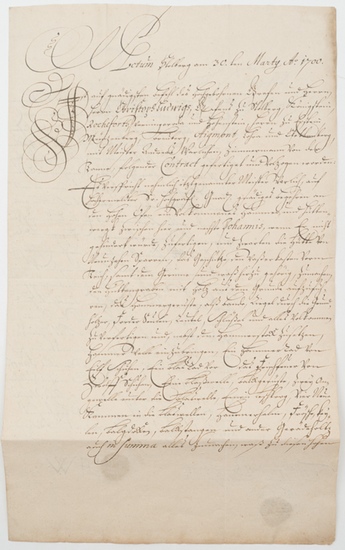 [Handschriftlicher Vertrag zu einer gräflichen Anordnung zwischen Christoph Ludwig I. zu Stolberg-Stolberg und einem Zimmermann über auszuführende Arbeiten im Berg- und Hüttenwesen in der Region Stolberg von 1700]. - Stolberg:, 1700. Manuskript: 1 Doppelblatt: 32,5 x 19,5 cm. Handschriftlicher Vertrag zu einer gräflichen Anordnung zwischen Christoph Ludwig I. Graf zu Stolberg-Stolberg und einem Zimmermann über auszuführende Arbeiten im Berg- und Hüttenwesen in der Region Stolberg/Harz "zwischen hier und rechter Johannis" vom 30. März 1700: "Auf gnädigsten Befehl des hochgebohrenen Grafen und Herrn, Herrn Christoph Ludwigs Grafens zu Stolberg, Königstein, Rochefort, Werningerode und Hohenstein, Herrn zu Epstein, Münzenberg, Breuberg, Aigmont, Bohra und Klettenberg mit Meister Andreas Warlichen, Zimmermann von [...]" sei "folgender Contract gefertigt und vollzogen worden: Es verspricht nehmlich itztgenannter Meister Warlich, auf hocherweldtes s[ei]n hochgräfl[iches] [...] gnädiges Begehren an den hohen Ofen ein volkommenes Hammer und Hüttenwergt zwischen hier und rechter Johannis (gemeint ist wohl der Bereich zwischen Stolberg und der bei Schwenda gelegenen, 1687 als hoffnungslos aufgegebenen "St. Johanniszeche"), wenn er nicht gehindert würde, zufertigen, und zwarten die Hütte von neunzehen Sparren, das Geschütze, den Waßerkasten vorm Beich, samt dem Gerinne und weß hirzu gehörig, zumachen, den Hüttengraben mit Holz aus dem Grunde aufzuführen, das Hammergerüste, alß Bande, Ziegel durch die Grundhölzer, Forderseulen, Zeutel, Schlüßel und alles volkommen zu verfertigen und nebst dem Hammerstock zusetzen, Hammerwelle anzubringen, ein Hammerbad von eilf Schuhen, ein Blasbad [...], eine Blaßwelle [...]. So versprechen S[ei]n[e] hochgräfl[iche] Gnad[en] die dazu geforderte materialia anzuschaffen, benöthigte Handlangung beym Zuthun zu leisten, auch vor Mauerwerk, Graben aufwerfen und Schutt führenzulassen [...] ohne des Zimmermannskosten auch ihm vor solches Werk in allem und vor alles fünfundsechzig Thaler und eine Wildhaut reichen zulassen womit auch derselbe zufrieden und solches Werk [...] versprochen; deswegen und zu beyderseits Versicherung dieses zweyfach mundiret und volzogen worden Actum ut Supra". - Auf der zweiten Seite unten links mit dem handschriftlichen Zusatz des zuständigen Kanzlei- und Kammerrats: "Theophilus Friedrich Werner Secret: auf gnädigsten Befehl solches unterschrieben" sowie daneben die eigenhändige Monogrammsignatur von Theophilus Friedrich Werner ("FTW"). Zwei Prägewappen (Schild mit Stolberger Hirsch). Auf dem zweiten Blatt mit der handschriftlichen Notiz: "Auf drüben stehenden Lohn seyend gezahlet [...], den 30. Marty 1700". - - - Christoph Ludwig I. zu Stolberg-Stolberg (1634-1704) war seit 1684 regierender Graf der zum Kurfürstentum Sachsen gehörigen Grafschaft Stolberg-Stolberg. In der Region wurde im Auftrag der Grafen zu Stolberg zeitweilig reger Bergbau betrieben. Insbesondere die Silbergewinnung war hier, vor allem am Ende des 17. und in der ersten Hälfte des 18. Jahrhunderts, sehr bedeutungsvoll. Mit der Münzprägung aus dem gewonnenen Silber begründete die Grafschaft zeitweilig sowohl den Wohlstand der Stadt, als auch der Stolberger Grafen. Nach der Errichtung eines Bergamts 1692 in Stolberg, mutete bzw. bebaute man in der Region zwischen Stolberg und Schwenda um 1700 insbesondere unter anderem die Gruben "Graf Johann Martin", "Hoffnung Gottes", "Graf Carolus", "Graf Christoph Ludwig", "Fürstin Louise Christina", "Ömler" sowie "Wille Gottes". Theophilus Friedrich Werner war gräflicher Kanzlei- und Kammerrat der Grafschaft. - - - Vormals gefaltet. In sehr guter Erhaltung. Historisch bedeutsamer Baustein der zum Teil nur lückenhaft bekannten Bergbau-Geschichte in der Region Stolberg.