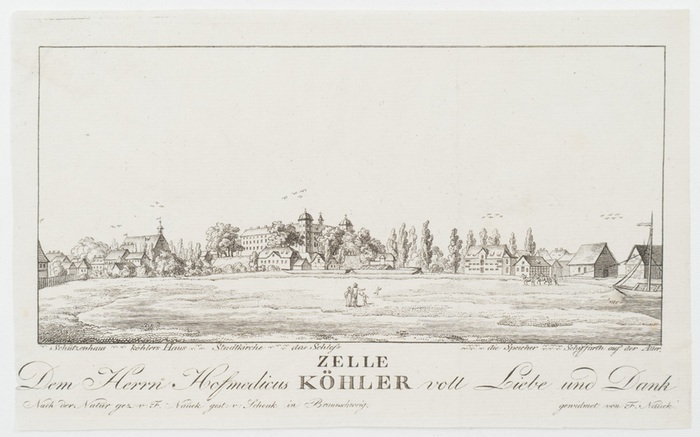 Zelle. Dem Herrn Hofmedicus Köhler voll Liebe und Dank. - [Celle-Stadtansicht von 1823] [1823]. 1 gestochenes Bl., montiert unter Passepartout, 8 x 16,7 cm (Bildmaß), 18 x 11,5 cm (Blattmaß). Stadtansicht von Celle (von der Dammaschwiese aus). Zu sehen u.a. Schützenhaus, Stadtkirche und Schloß. - Gestochen von Karl-Wilhelm Schaub (1785-1827) nach einer Vorlage von Fr. Nauck. - Im Druck dem in Celle praktizierenden Arzt und Medizinalrat Ludwig Andreas Köhler (1773-1836) gewidmet. - Etwas knickspurig; gutes Exemplar.