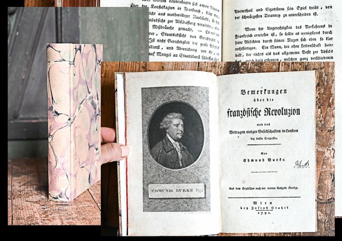 Bemerkungen über die französische Revoluzion und das Betragen einiger Gesellschaften in London bey diesen Ereignissen. Aus dem Englischen nach der vierten Ausgabe übersetzt. Wien, Stahel, 1791. 8°., Gestochenes Portrait, 2 Bll., 432 SS.. Neuerer marmorierter Pappband Erste Ausgabe der ersten deutschen Übersetzung von Burkes Hauptwerk, das englisch im Vorjahr 1790 erschienen war und einen der wichtigsten Beiträge in der Diskussion um die Neuerungen der Französischen Revolution, wobei Burke sich gegen ihre Ideologen wendet und das Ancien Regime verteidigt. Einige Jahre später erschien eine weitere Übersetzung von Gentz, die vorliegende ist anonym. - Kleiner alter Besitzvermerk, nur wenig gebräunt, sonst gut erhalten.