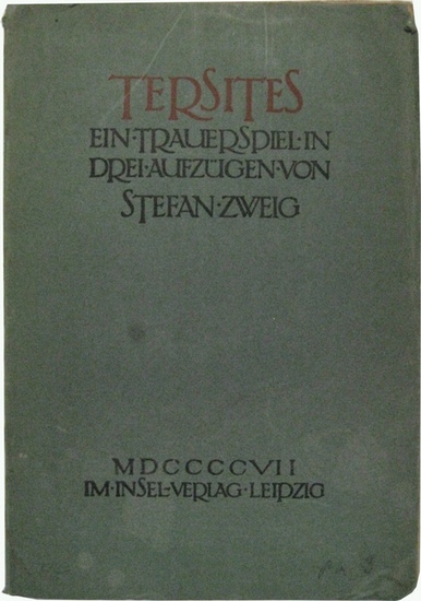 Tersites. Ein Trauerspiel in drei Aufzügen. Leipzig, Insel, 1907. 138 S. 8°, OKart. Seltene Erstausgabe. - Buch über das Schicksal des griechischen Sagenhelden Tersites, der als hässlich und böse gilt. Es handelt sich um das erste Drama, das von Stefan Zweig (1881 ? 1942) als Trauerspiel in drei Akten zwischen 1903 und 1906 verfasst wurde. - Einband fleckig, knickspurig und am Rand bestoßen, der Textteil ist im guten Zustand.
