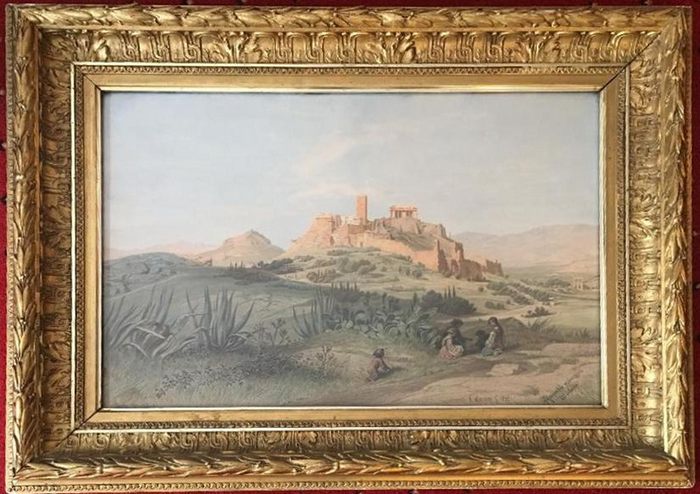 'Akropolis von der Westseite' : Mittig prächtige Ansicht der Tempelanlage in Hügelkette, davor Personenstaffage mit Agaven und Kakteen. Im Druck bezeichnet 'Akropolis v. der Westseite' und im Druck signiert C. Werner f[ecit]1876. Wandsbeck, Seitz (Druck), (1876). Farblithografie unter Glas in prächtigem breitrandigem Spätbiedermeierrahmen von George Behrens (Etikett). Bildformat 36 x 53 cm, Rahmengrösse 55 x 71 cm, *Thieme/Becker XXV, 404.- Nagler.- Boetticher.- u.v.a. Rahmen mit geringen Abplatzern, schönes gepflegtes Exemplar, Architektur-, Landschaftsmaler (Öl- und Aquarell) und Lithograph.- Akademische Studien der Malerei in Leipzig und und Architektur in München bei Friedrich von Gärtner.- jahrzehntelanger Aufenthalt in Rom und dort Vorsitzender des Deutschen Künstlervereins.- später große Auslandsreisen nach England, Spanien, Palästina, Griechenland und Italien.- Ab 1882 bis zu seinem Tod war Werner Lehrer an der Königlichen Kunstakademie in Leipzig für Aquarellmalerei.-.