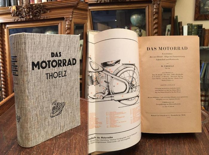 Das Motorrad : Konstruktion, Bau und Betrieb, Pflege und Instandsetzung, Fahrtechnik und Wettbewerbe. Vollständig neu bearbeitet von Jochim Fischer, Helmut Hütten, Helmut Kümmel und Kurt Menges. Braunschweig; Berlin, Richard Carl Schmidt & Co, 1953. 8° (23x15), XVII, 908 S., 4 Bl., mit 658 Abb., 7 gefalteten teils farb Tafeln + 25 S. Heft-Beilage in Deckelschlaufe 'Tabellenwerte zur Einregulierung von Motorradmotoren', Oln mit TitelPrägung,. Einband etwas angestaubt, Papier leicht gebräunt, kaum genutzt, gutes gepflegtes Exemplar,