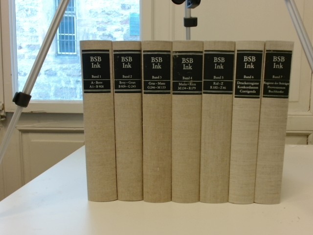 Bayerische Staatsbibliothek Inkunabelkatalog (unvollständig in 7 von 8 Bänden. Ein 8. englischer Band erschien 2021.). BSB-Ink. Wiesbaden: Reichert, 1988 - 2009. Großformat, Orig.-Leinenbände. Gutes Exemplar mit nur leichten Gebrauchsspuren. Textsauber und aus einem Nichtraucherhaushalt. Das Exemplar ist unvollständig in 1 - 7 von 8 Bänden. Ein 8. englischer Band erschien im Jahr 2021. // Original hardcovers. Clean books in good condition. Books from a non smoking environment. The exemplar is incomplete in 1 - 7 of 8 volumes. Volume 8 in english language was published in the year 2021. Dieses Exemplar stammt aus der Bibliothek von Peter Amelung (Württembergische Landesbibliothek Stuttgart).