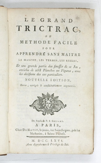 Le grand Trictrac, ou methode facile pour apprendre sans maitre la marche, les termes, les regles, et une grande partie des finesses de ce jeu, enrichie de 288 planches ou figures, avec les décisions des cas particuliers. Nouvelle édition, revue, corrigée & considérablement augmentée. Paris, du fonds de P. F. Giffart chez De Hansy le jeune, 1766. XVI, 357, (3) SS. Mit zahlreichen Textholzschnitten. Halblederband der Zeit mit goldgepr. grünem Rückenschildchen. 8vo. Dritte Ausgabe (EA 1738) der reich illustrierten Spielanleitung des Backgammon (das beim vorrevolutionären französischen Adel beliebte "Trictrac"). Anonym verfaßt vom frz. Ingenieur, Mathematiker und Theologen B.-L. Soumille (1703-74). - Stellenweise leicht braunfleckig und vereinzelt minimal fingerfleckig. Einband an Ecken und Kanten berieben und bestoßen. Gelenke angeplatzt. - Querard IX, 230. Hargrave 208. OCLC 6968861 u. 52793714. Barbier II, 565 c. BN 175, 954.